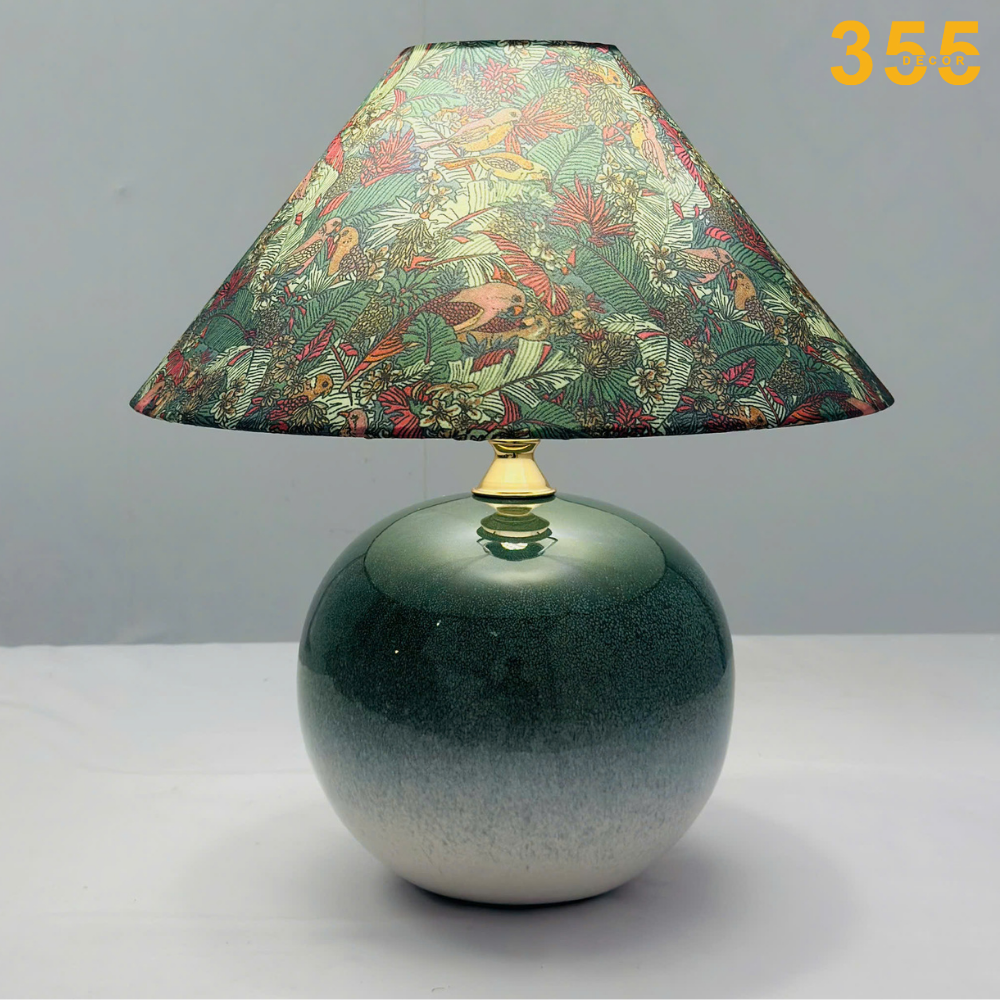 Đèn Bàn DB92 sở hữu chao đèn hình nón cổ điển với họa tiết lá thông và hoa văn tự nhiên, phối màu trầm ấm tạo cảm giác thư thái, gần gũi với thiên nhiên. Phần thân đèn làm bằng gốm sứ tráng men cao cấp, mang sắc xanh ngọc độc đáo, giúp cân bằng ánh sáng và tạo chiều sâu thẩm mỹ.