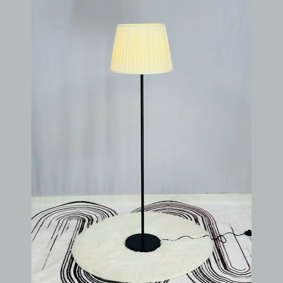 Đèn Đứng DD211 được thiết kế với thân đèn dạng trụ thẳng, cao khoảng 1m52, dáng rất thon nên không chiếm nhiều diện tích sàn. Phần đế tròn có đường kính lớn hơn thân, tạo điểm tựa vững chắc, giúp đèn đứng ổn định ngay cả khi đặt gần khu vực đi lại. Chao vải hình nón cao, xếp ly đều từ trên xuống dưới, ôm trọn bóng đèn bên trong. Khi bật sáng, ánh sáng vàng ấm xuyên qua lớp vải gấp nếp tạo nên quầng sáng mềm, lan đều xung quanh, khiến không gian trở nên ấm và thư giãn hơn.