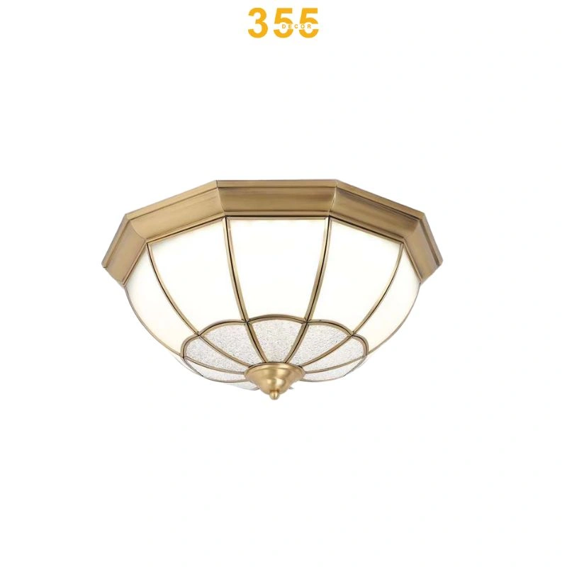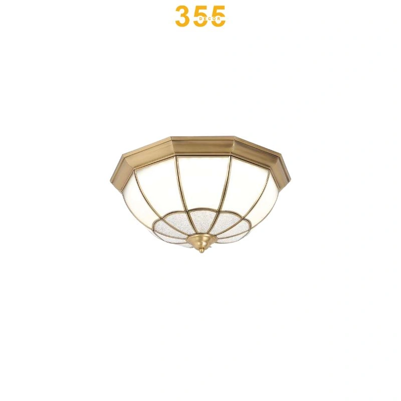 Đèn OD04 có dáng tròn bo viền vàng đồng mềm mại, kết hợp họa tiết khung kim loại chia khoang tạo thành từng ô kính riêng biệt. Kiểu dáng này không chỉ giúp ánh sáng tán quang đều mà còn làm nổi bật đường nét sang trọng của thiết kế, rất thích hợp cho các không gian đèn ốp trần đồng biệt thự hay khu vực hành lang cổ điển.